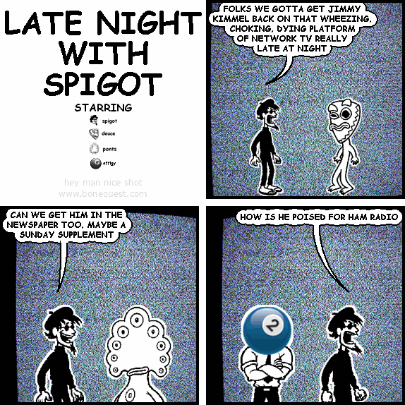 spigot: FOLKS WE GOTTA GET JIMMY KIMMEL BACK ON THAT WHEEZING, CHOKING, DYING PLATFORM OF NETWORK TV REALLY LATE AT NIGHT spigot: CAN WE GET HIM IN THE NEWSPAPER TOO, MAYBE A SUNDAY SUPPLEMENT spigot: HOW IS HE POISED FOR HAM RADIO