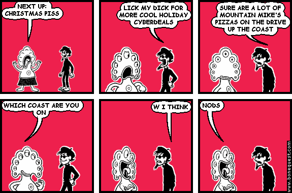 pants: NEXT UP: CHRISTMAS PISS spigot: LICK MY DICK FOR MORE COOL HOLIDAY CYBERDEALS spigot: SURE ARE A LOT OF MOUNTAIN MIKE'S PIZZAS ON THE DRIVE UP THE COAST pants: WHICH COAST ARE YOU ON spigot: W I THINK pants: NODS