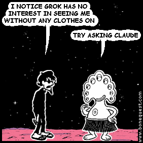 spigot: I NOTICE GROK HAS NO INTEREST IN SEEING ME WITHOUT ANY CLOTHES ON pants: TRY ASKING CLAUDE