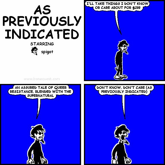 spigot: I'LL TAKE THINGS I DON'T KNOW OR CARE ABOUT FOR $200 spigot: AN ASSURED TALE OF QUEER RESISTANCE, BLENDED WITH THE SUPERNATURAL spigot: DON'T KNOW, DON'T CARE (AS PREVIOUSLY INDICATED)