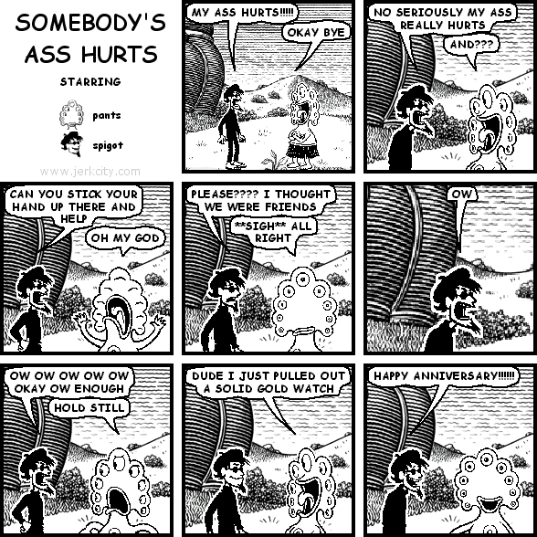 spigot: MY ASS HURTS!!!!!! pants: OKAY BYE spigot: NO SERIOUSLY MY ASS REALLY HURTS pants: AND??? spigot: CAN YOU STICK YOUR HAND UP THERE AND HELP pants: OH MY GOD spigot: PLEASE???? I THOUGHT WE WERE FRIENDS pants: **SIGH** ALL RIGHT spigot: OW spigot: OW OW OW OW OW OKAY OW ENOUGH pants: HOLD STILL pants: DUDE I JUST PULLED OUT A SOLID GOLD WATCH spigot: HAPPY ANNIVERSARY!!!!!!