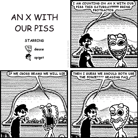 spigot: I AM COUNTING ON AN X WITH OUR PISS THIS SATURDAY !!!!!!!!!! BRING PROTRACTOR deuce: IF WE CROSS BEAMS WE WILL DIE spigot: THEN I GUESS WE SHOULD BOTH USE THE FORCE???? READING FAQ