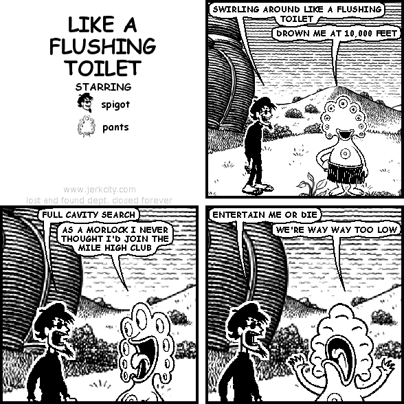 spigot: SWIRLING AROUND LIKE A FLUSHING TOILET pants: DROWN ME AT 10,000 FEET spigot: FULL CAVITY SEARCH pants: AS A MORLOCK I NEVER THOUGHT I'D JOIN THE MILE HIGH CLUB spigot: ENTERTAIN ME OR DIE pants: WE'RE WAY WAY TOO LOW