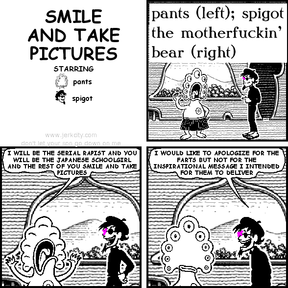 : pants (left); spigot the motherfuckin' bear (right) pants: I WILL BE THE SERIAL RAPIST AND YOU WILL BE THE JAPANESE SCHOOLGIRL AND THE REST OF YOU SMILE AND TAKE PICTURES spigot: I WOULD LIKE TO APOLOGIZE FOR THE FARTS BUT NOT FOR THE INSPIRIATIONAL MESSAGE I INTENDED FOR THEM TO DELIVER