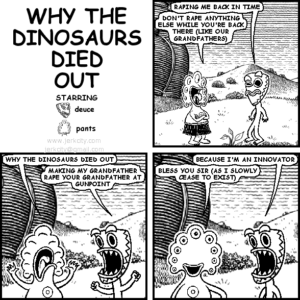 deuce: RAPING ME BACK IN TIME pants: DON'T RAPE ANYTHING ELSE WHILE YOU'RE BACK THERE (LIKE OUR GRANDFATHERS) pants: WHY THE DINOSAURS DIED OUT deuce: MAKING MY GRANDFATHER RAPE YOUR GRANDFATHER AT GUNPOINT deuce: BECAUSE I'M AN INNOVATOR pants: BLESS YOU SIR (AS I SLOWLY CEASE TO EXIST)