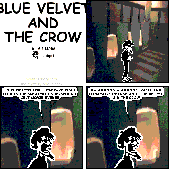 spigot: I'M NINETEEN AND THEREFORE FIGHT CLUB IS THE GREATEST UNDERGROUND CULT MOVIE EVER!!!!!!! spigot: WOOOOOOOOOOOOOOO BRAZIL AND CLOCKWORK ORANGE AND BLUE VELVET AND THE CROW