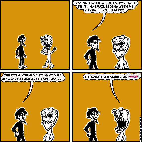spigot: LOVING A WEEK WHERE EVERY SINGLE TEXT AND EMAIL BEGINS WITH ME SAYING "I AM SO SORRY" spigot: TRUSTING YOU GUYS TO MAKE SURE MY GRAVE STONE JUST SAYS "SORRY" deuce: I THOUGHT WE AGREED ON `<WUP>`