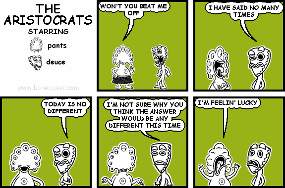 pants: WON'T YOU BEAT ME OFF deuce: I HAVE SAID NO MANY TIMES deuce: TODAY IS NO DIFFERENT deuce: I'M NOT SURE WHY YOU THINK THE ANSWER WOULD BE ANY DIFFERENT THIS TIME pants: I'M FEELIN' LUCKY