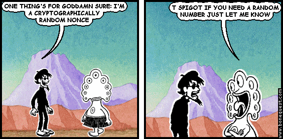 spigot: ONE THING'S FOR GODDAMN SURE: I'M A CRYPTOGRAPHICALLY RANDOM NONCE pants: T SPIGOT IF YOU NEED A RANDOM NUMBER JUST LET ME KNOW