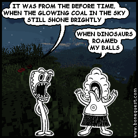 deuce: IT WAS FROM THE BEFORE TIME, WHEN THE GLOWING COAL IN THE SKY STILL SHONE BRIGHTLY pants: WHEN DINOSAURS ROAMED MY BALLS