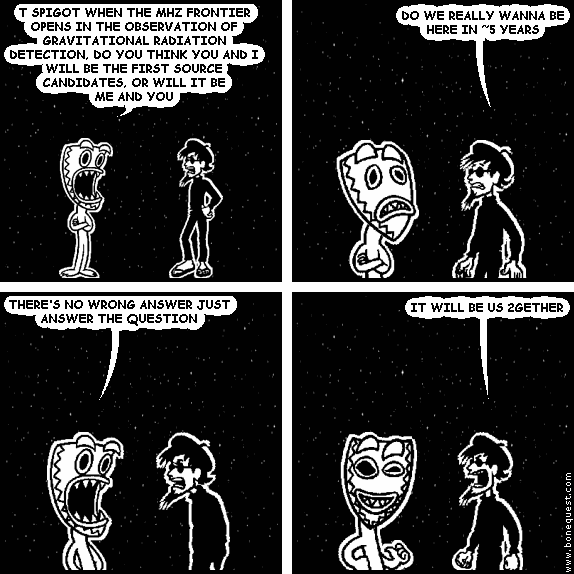 deuce: T SPIGOT WHEN THE MHZ FRONTIER OPENS IN THE OBSERVATION OF GRAVITATIONAL RADIATION DETECTION, DO YOU THINK YOU AND I WILL BE THE FIRST SOURCE CANDIDATES, OR WILL IT BE ME AND YOU spigot: DO WE REALLY WANNA BE HERE IN ~5 YEARS deuce: THERE'S NO WRONG ANSWER JUST ANSWER THE QUESTION spigot: IT WILL BE US 2GETHER