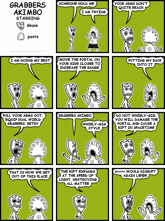 deuce: SOMEONE HOLD ME pants: I AM TRYING deuce: YOUR ARMS DON'T QUITE REACH pants: I AM DOING MY BEST deuce: MOVE THE PORTAL ON YOUR SIDE CLOSER TO INCREASE THE RANGE pants: PUTTING MY BACK INTO IT deuce: PULL YOUR ARMS OUT, EQUIP DUAL WIELD GRABBERS, RETRY deuce: GRABBERS AKIMBO pants: WHIRLY-GIG STYLE deuce: DO NOT WHIRLY-GIG, YOU WILL DAMAGE THE PORTAL AND CAUSE A RIFT IN SPACETIME pants: THAT IS HOW WE GET OUT OF THIS PLACE deuce: THE RIFT EXPANDS AT THE SPEED OF LIGHT, DESTROYING ALL MATTER deuce: A++++ WOULD DISRUPT AGAIN L@@K