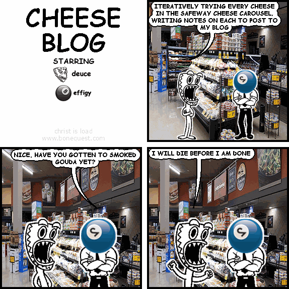 deuce: ITERATIVELY TRYING EVERY CHEESE IN THE SAFEWAY CHEESE CAROUSEL, WRITING NOTES ON EACH TO POST TO MY BLOG effigy: NICE. HAVE YOU GOTTEN TO SMOKED GOUDA YET? deuce: I WILL DIE BEFORE I AM DONE