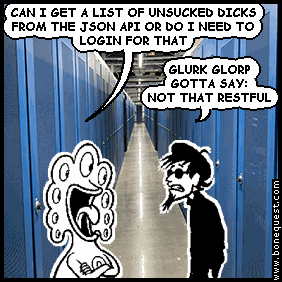 pants: CAN I GET A LIST OF UNSUCKED DICKS FROM THE JSON API OR DO I NEED TO LOGIN FOR THAT spigot: GLURK GLORP GOTTA SAY: NOT THAT RESTFUL