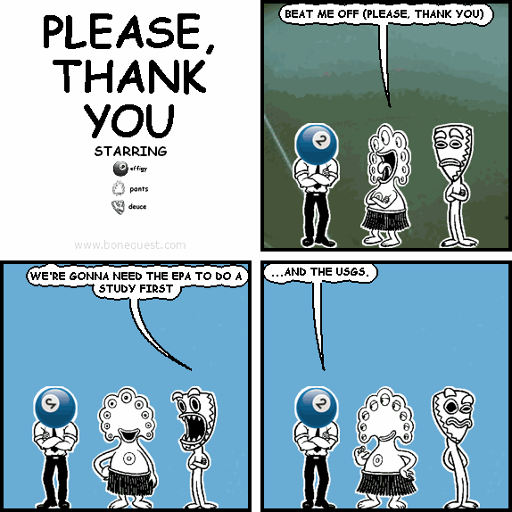 pants: BEAT ME OFF (PLEASE, THANK YOU) deuce: WE'RE GONNA NEED THE EPA TO DO A STUDY FIRST effigy: ...AND THE USGS.