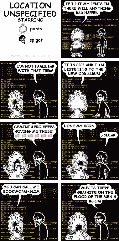 pants: IF I PUT MY PENIS IN THERE WILL ANYTHING BAD HAPPEN spigot: I'M NOT FAMILIAR WITH THAT TERM pants: IT IS 2025 AND I AM LISTENING TO THE NEW ORB ALBUM spigot: GEMINI 3 PRO KEEPS GIVING ME THESE: :TRANSGENDER_FLAG: :TRANSGENDER_FLAG: :TRANSGENDER_FLAG: :TRANSGENDER_FLAG: :TRANSGENDER_FLAG: :TRANSGENDER_FLAG: pants: HONK MY HORN spigot: /CLEAR pants: YOU CAN CALL ME BOOKWORM-SLIM spigot: WHY IS THERE GRAPHITE ON THE FLOOR OF THE MEN'S ROOM