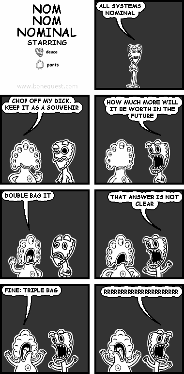 deuce: ALL SYSTEMS NOMINAL pants: CHOP OFF MY DICK, KEEP IT AS A SOUVENIR deuce: HOW MUCH MORE WILL IT BE WORTH IN THE FUTURE pants: DOUBLE BAG IT deuce: THAT ANSWER IS NOT CLEAR pants: FINE: TRIPLE BAG deuce: RRRRRRRRRRRRRRRRRRRRRR