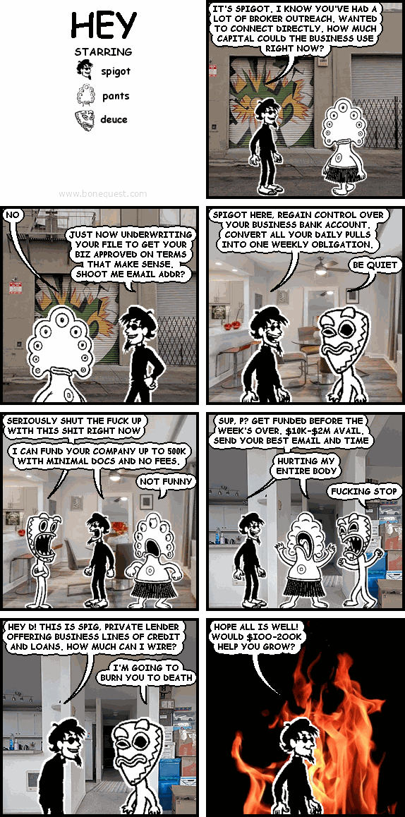 spigot: IT'S SPIGOT. I KNOW YOU'VE HAD A LOT OF BROKER OUTREACH. WANTED TO CONNECT DIRECTLY. HOW MUCH CAPITAL COULD THE BUSINESS USE RIGHT NOW? [[SHIPPING]] pants: NO [[SHIPPING]] spigot: JUST NOW UNDERWRITING YOUR FILE TO GET YOUR BIZ APPROVED ON TERMS THAT MAKE SENSE. SHOOT ME EMAIL ADDR? spigot: SPIGOT HERE, REGAIN CONTROL OVER YOUR BUSINESS BANK ACCOUNT. CONVERT ALL YOUR DAILY PULLS INTO ONE WEEKLY OBLIGATION. [[POTOMAC]] deuce: BE QUIET deuce: SERIOUSLY SHUT THE FUCK UP WITH THIS SHIT RIGHT NOW [[POTOMAC]] spigot: I CAN FUND YOUR COMPANY UP TO 500K WITH MINIMAL DOCS AND NO FEES. pants: NOT FUNNY spigot: SUP, P? GET FUNDED BEFORE THE WEEK'S OVER. $10K-$2M AVAIL. SEND YOUR BEST EMAIL AND TIME pants: HURTING MY ENTIRE BODY[[PORTLAND]] deuce: FUCKING STOP spigot: HEY D! THIS IS SPIG, PRIVATE LENDER OFFERING BUSINESS LINES OF CREDIT AND LOANS. HOW MUCH CAN I WIRE? [[PORTLAND]] deuce: I'M GOING TO BURN YOU TO DEATH spigot: HOPE ALL IS WELL! WOULD $IOO-2OOK HELP YOU GROW? [[FIRE]]