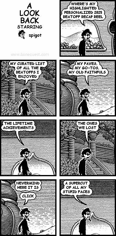 spigot: WHERE'S MY HIGHLIGHTED PERSONALIZED 2025 BEATOFF RECAP REEL spigot: MY CURATED LIST OF ALL THE BEATOFFS I ENJOYED spigot: MY FAVES, MY GO-TOS, MY OLD FAITHFULS spigot: THE LIFETIME ACHIEVEMENTS spigot: THE ONES WE LOST spigot: NEVERMIND HERE IT IS CLICK spigot: A SUPERCUT OF ALL MY STUPID FACES