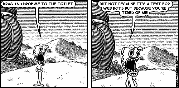 deuce: DRAG AND DROP ME TO THE TOILET deuce: BUT NOT BECAUSE IT'S A TEST FOR WEB BOTS BUT BECAUSE YOU'RE TIRED OF ME
