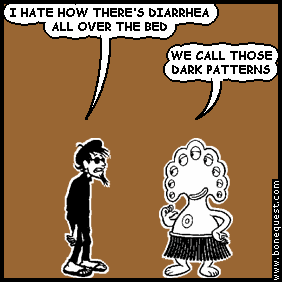 spigot: I HATE HOW THERE'S DIARRHEA ALL OVER THE BED pants: WE CALL THOSE DARK PATTERNS